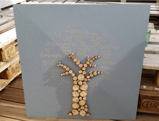 Auf einer Trägerplatte aus Holz habe ich den Stamm aus vielen kleinen Holzscheiben erstellt und die Krone des Baumes mit individuellen Gravuren versehen.